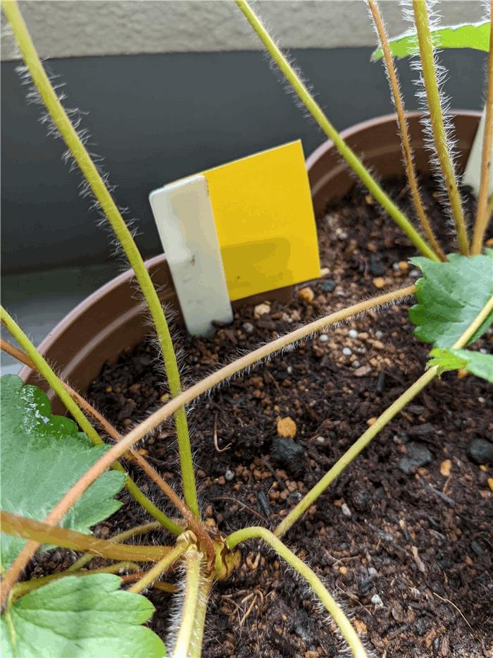 交換のシールを適当なサイズに切って、同じくダイソーで売っている植物用のネームプレートに貼って、旗のような形状にします。 ネームプレートは使い古しの捨ててもいいものが余っていましたので使いましたが、割りばしなどでも大丈夫です。