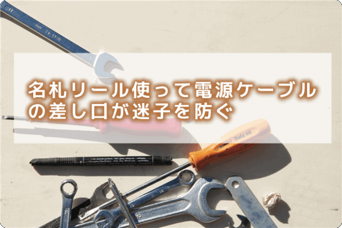 - リールの先の部分(通常、名札を付ける位置)に電源ケーブルを固定する