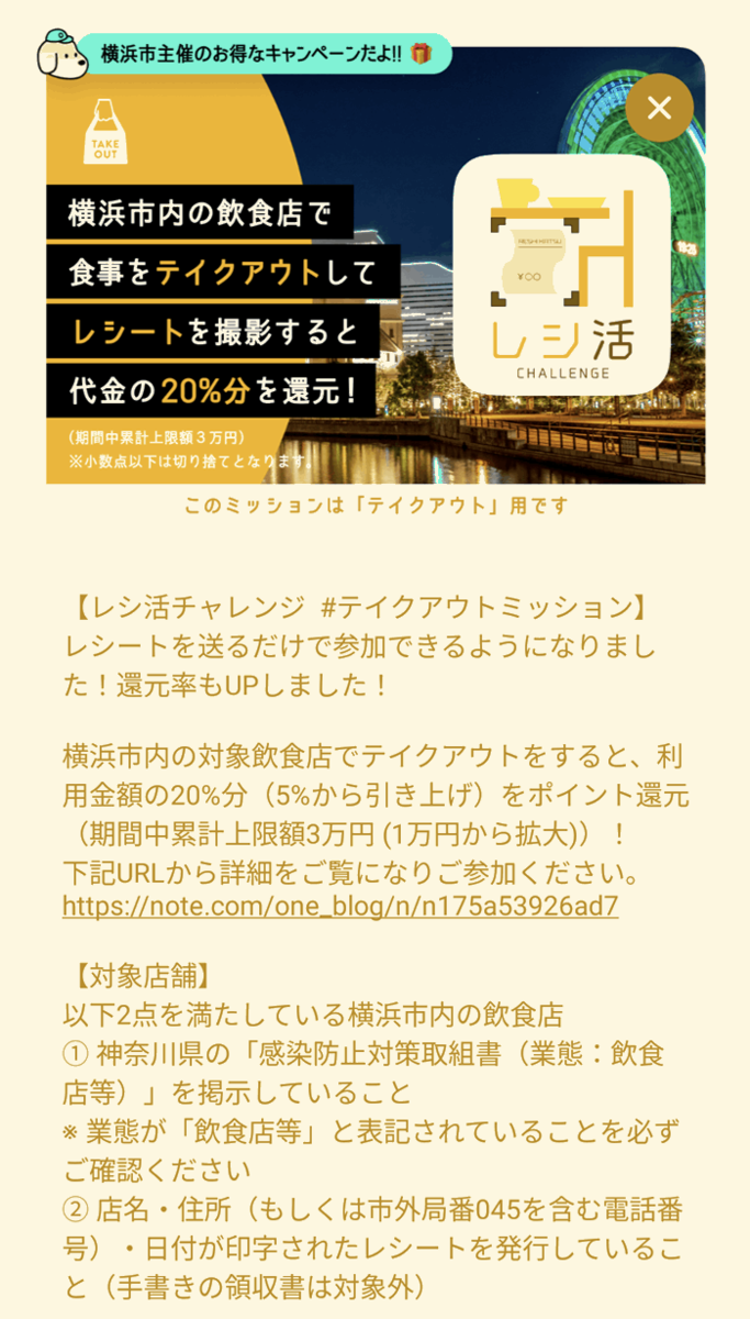 レシート撮影アプリでレシートを投稿すると、購入額の20%の還元が受けられるサービスです。 横浜市の飲食店応援の企画らしく、横浜市内の飲食店であれば20%のポイントがもらえるようです。