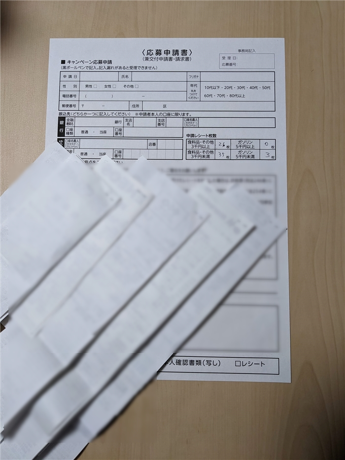 作成した申請書と、本人確認書類*1と、束ねたレシートを封筒に入れます。